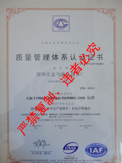 ???? 这里感谢中鉴公司相关负责人严谨的检测工作,同时也热烈祝贺我厂获得国家认证体系证书。给郑州市金马游乐设备厂又添加新荣誉。证书只是一个象征,我们会以更加热忱的工作,更为周到的服务,更加好的产品质量回馈每一位我厂的购买者。同时也希望大家能够积极地为郑州市金马游乐设备厂做宣传。我厂的发展离不开广大买家,广大玩家的大力支持和帮助。